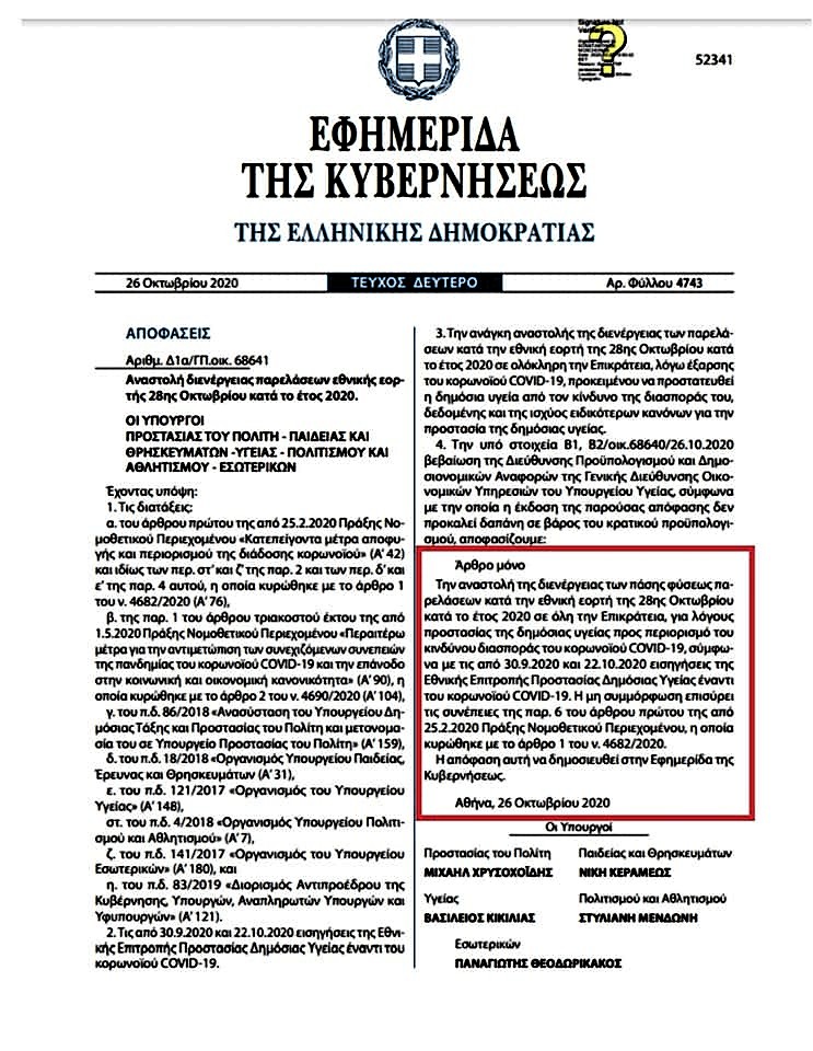 Η πραγματικότητα είναι μία: Ότι οι κυβερνώντες βρήκαν αφορμή για να σταματήσουν τις στρατιωτικές και λοιπές παρελάσεις επί τη επετείω της 28ης Οκτωβρίου και οι εκδηλώσεις εορτασμού του έπους του 1940!